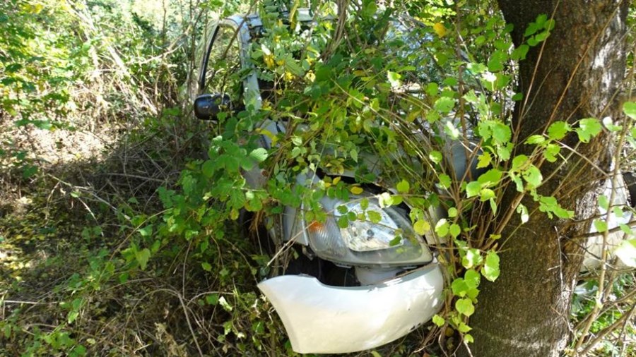 Лек автомобил "Тойота" с пернишка регистрация излетя от главен път Е-79 и се заби в дърво край Симитли, по чудо няма пострадали.