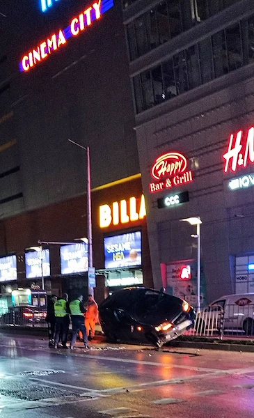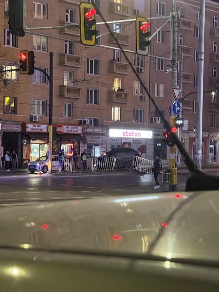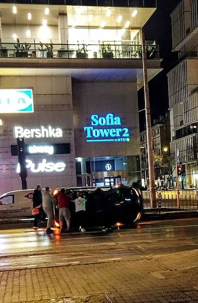 Лек автомобил претърпя зрелищна катастрофа през изминалата нощ на възлово кръстовище в София. Превозното средство е излязло от пътното платно и се е озовало странично върху металните разделителни ограждения в района на търговския център на булевардите „Генерал Михаил Д. Скобелев“ и „Александър Стамболийски“.