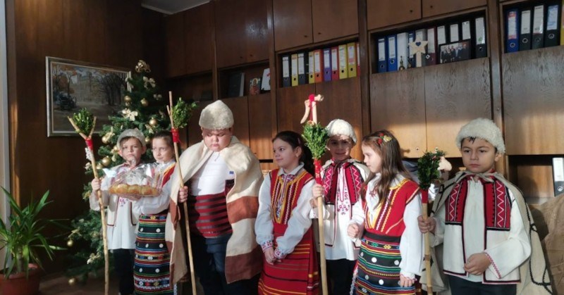 Облечени в красиви народни носии, първокласници пресъздадоха обичая коледуване и отправиха послания към общинските съветници, като наричаха за здраве и берекет с ръчно изработените си сурвакници.
