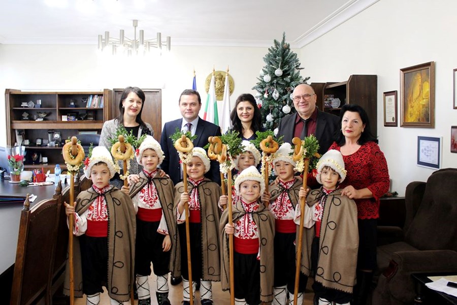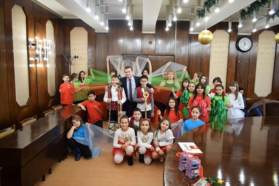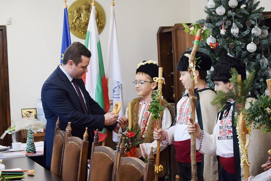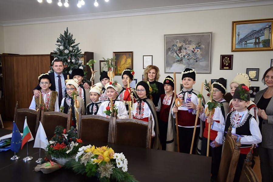Децата изпълниха коледарски песни и наричания към стопанина на общината за здраве, берекет и да се множат успехите на Русе и русенци.