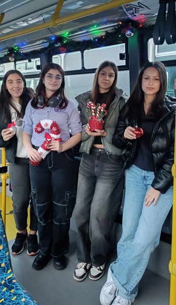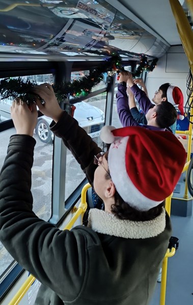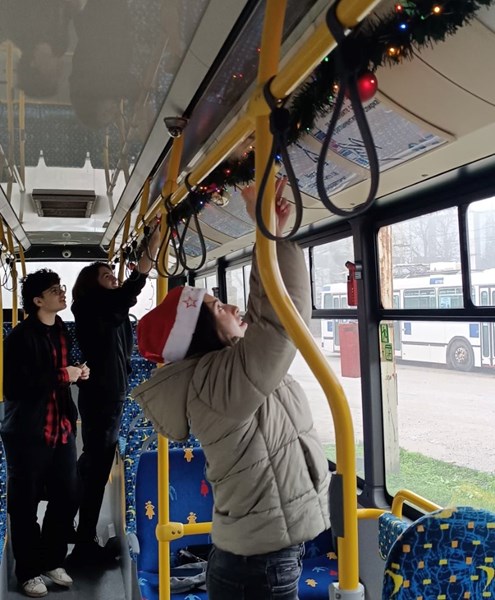 Сръчните ръце на младите доброволци превърнаха част от автопарка в пътуващи коледни картички, като целта е духът на Коледа да се усеща по време на движение из целия град.