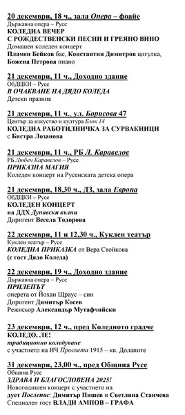 Запалването на коледната елха постави началото на богатата програма на Коледно-новогодишния фестивал в Русе, който ще продължи до новогодишната нощ, когато русенци ще посрещнат 2025 година с концерт на Владимир Ампов-Графа. Пълната програма на фестивала можете да видите в Галерията ни.