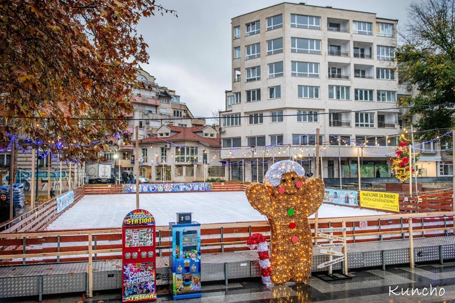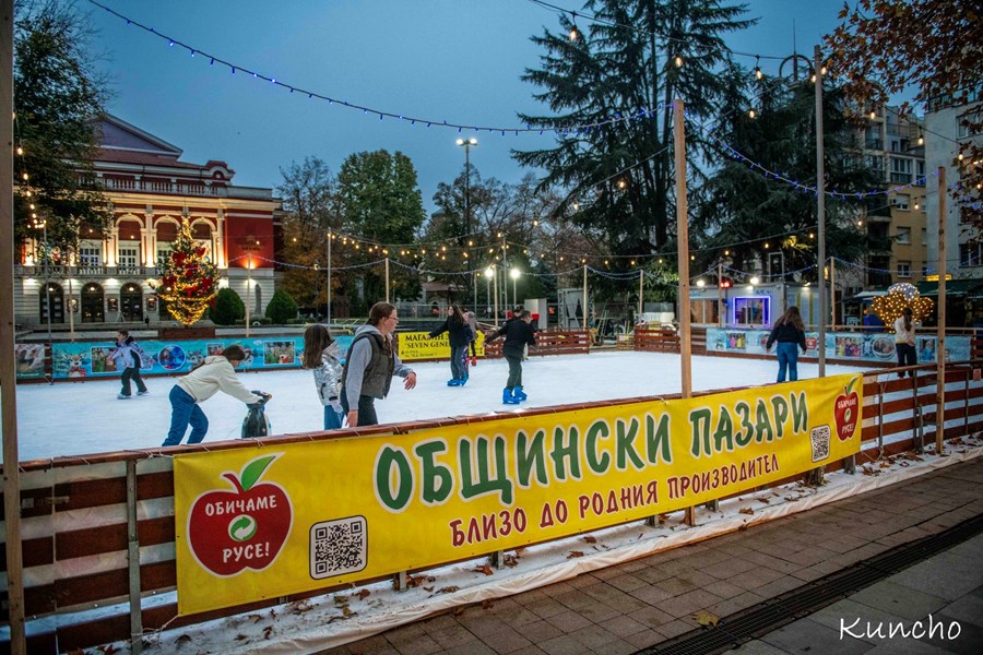 Коледният базар и ледената пързалка са разположени на традиционното си място в центъра на Русе. Тази година съоръженията и къщичките отново създават уютна атмосфера, допълнена от празничните светлини.