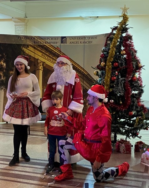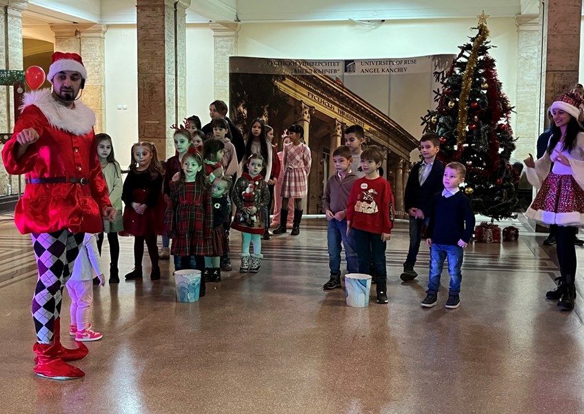 Огромен бял мечок и коледни джуджета посрещнаха децата на преподаватели и служители в Русенския университет "Ангел Кънчев". Празничното събитие се проведе вчера, 16 декември, във фоайето на Ректората и бе организирано от сдружение "Университетски синдикат" със съдействието на Центъра за продължаващо обучение.