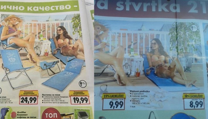 Както можете да се уверите на снимката, летен шезлонг на промоция със знак „специална оферта“ в България „Кауфланд“ го продават за 24,99 лева или 12.78 евро, което е с 2.79 евро по-скъпо от цената (9.99 евро) в Словакия.