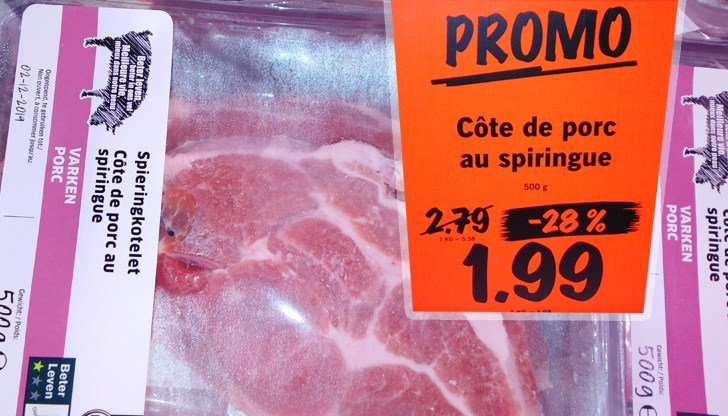 Днес си купих опаковка с пържоли от голяма верига в Белгия. Както виждате на снимките които съм качил заплатих 1,99 евро за 500 грама свежо месо. Това в български пари прави под 7,80 лева за килограм което е с около 5 лева по - ниска цена от средните цени в България в момента.
