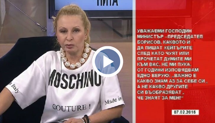 В предаването по Канал 3 тази вечер, на журналистката Илиана Беновска, "Беновска пита", тя се обърна към премиера Борисов.