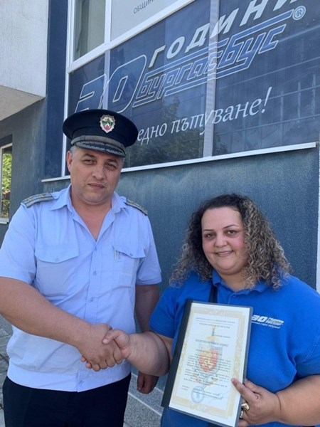 За благородната постъпка Мария Добрева получи от Областната дирекция на МВР-Бургас благодарствен адрес, връчен ѝ от временно изпълняващия длъжността началник отдел "Охранителна полиция и КАТ" старши инспектор Павел Колев.