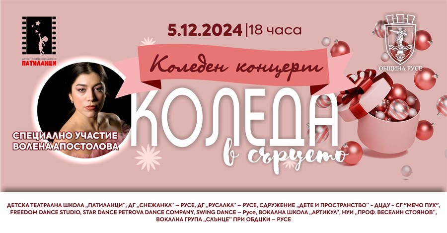 Община Русе и Детска театрална школа „Патиланци" организират благотворителен концерт-спектакъл под надслов „Коледа в сърцето – Чудеса на надеждата". Събитието ще се проведе на 5 декември 2024 година от 18:00 часа в Голямата зала на Доходното здание.