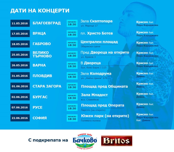 По този повод организира концерти в цялата страна. Концертите са с участието на нашумелия хип-хоп изпълнител Криско, сексапилната Лора Караджова и русенската сензация Дивна.