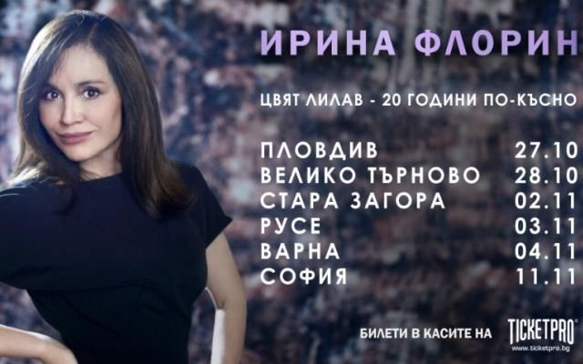 Тази година Ирина Флорин представя Националното си турне ЦВЯТ ЛИЛАВ — 20 ГОДИНИ ПО-КЪСНО.