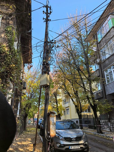 В публикацията си във Фейсбук г-жа Иванова описва тревожната ситуация: "Опасен уличен осветителен стълб, корозирал в основата си и с нарушена структура от това. Въпрос на време е да падне, можем да залагаме накъде... Кабелаците ще го задържат още известно време, можем да залагаме колко..."