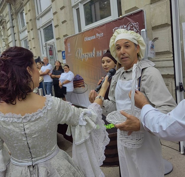 Актьорът от ДТ „Сава Огнянов“ Милен Димитров се превъплъти в ролята на австроунгареца сладкар Коста Гараш по време на Фестивала на торта Гараш.