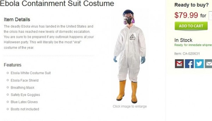 Сайт за онлайн пазаруване се предлага костюм против ебола за Хелоуин на цена от 79,99 щатски долара. 30 000 души се включиха в обществен дебат дали това е нормално, или е поредното доказателство за деградацията на обществото, пише БиБиСи.
