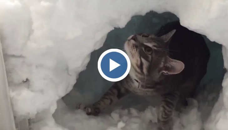 Умното коте започна „строежа“, веднага щом нейния стопанин фотожурналист Адам Стивънс отвори вратата на вътрешния двор. Лапичките му продължаваха да копаят, докато не направиха достатъчно място да се настани телцето му в снега.