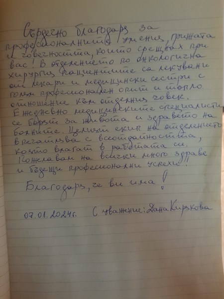 КОЦ - Русе получи благодарствено писмо от пациентка