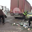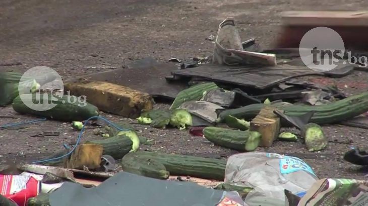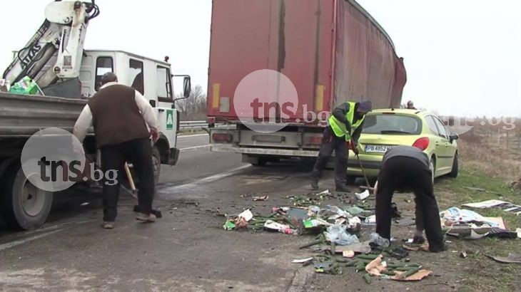 От удара част от продукцията се е разпиляла по пътното платно. Няма пострадали при инцидента, но са нанесени значителни материални щети по тежкотоварните камиони.