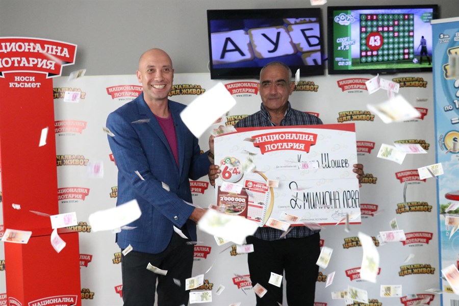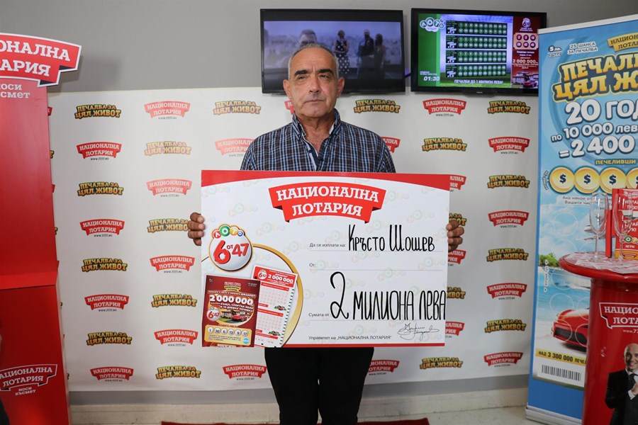 54-годишният Кръсто Шошев от град Петрич е големият късметлия, който спечели джакпота в играта „Лото 6 от 47“ на 29 юли. Правилното предвиждане на шестте печеливши числа му донесе 2 милиона лева, включващи къща, спортна кола и 10-дневна почивка за двама в Дубай. Щастливецът е осмият милионер в Национална лотария от началото на годината. Чек за страхотната печалба му връчи Захари Бахаров.