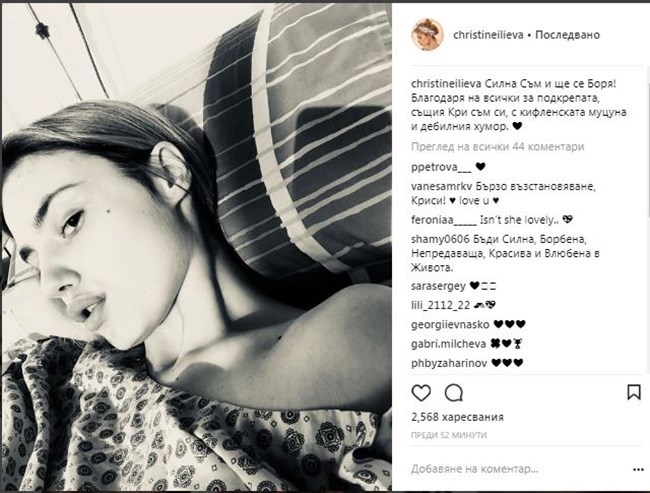 "Силна Съм и ще се Боря! Благодаря на всички за подкрепата, същия Кри съм си, с кифленската муцуна и дебилния хумор", пише Кристин под снимката.