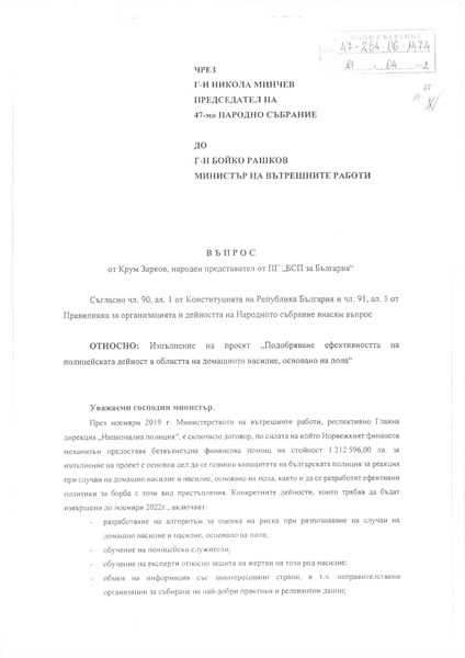 Народният представител от групата на БСП Крум Зарков пита в парламентарен въпрос вътрешния министър Бойко Рашков за напредъка по договор, сключен през 2019 г. от Министерството на вътрешните работи, по силата на който Норвежкият финансов механизъм предоставя безвъзмездна финансова помощ на стойност 1 212 596 лв. за изпълнение на проект с основна цел да се повиши капацитета на българската полиция за реакция при случаи на домашно насилие и насилие, основано на пола, както и да се разработят ефективни политики за борба с този вид престъпления, отбеляза ГЛАСОВЕ.