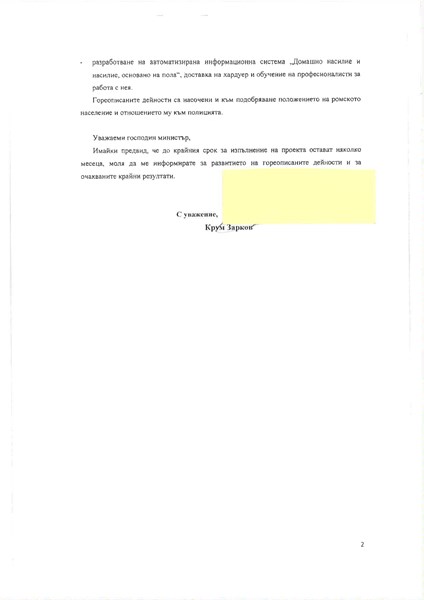 Сред конкретните действия, които трябва да бъдат извършени до 2022 г., Зарков цитира: разработването на алгоритъм за за оценка на риска при разпознаване на случаи на домашно насилие и насилие, основано на пола; обучението на полицейски служители; обучение на експерти относно защита на жертви на този род насилие; обмен на информация със заинтересовани страни за събиране на най-добри практики и релевантни данни; разработване на автоматизирана информационна система „Домашно насилие и насилие, основано на пола“, доставка на хардуер и обучение на професионалисти за работа с нея.