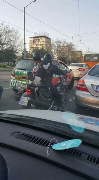 На фотоса се вижда животинчето, което се вози по улиците на София на специална седалка, „хванало” се здраво за раменете на стопанина си. Той пък, от своя страна, се е погрижил добре за външния вид на приятелчето си. Кучето е облечено с кожено елече, а на главата си има каска.