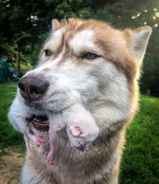 Щом котенцата били пренесени в дома на г-жа Брали, хъскито не се отделило от тях, като ги ближело, премествало в устата си и почиствало.