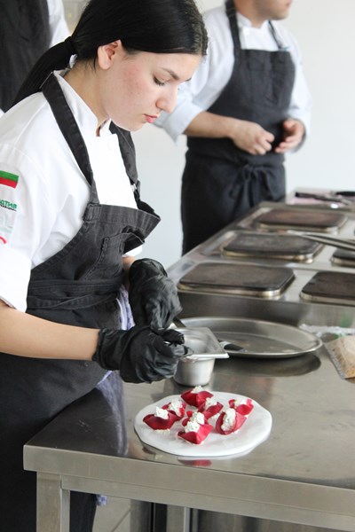 Стефани Коева впечатли присъстващите с изискано студено предястие – дъмплинг от цвекло с пълнеж от крема сирене и зелен лук, допълнен с кръмбъл, пармезан и перли от лимон. Изящната презентация и балансираният вкус предизвикаха истински фурор сред учениците.