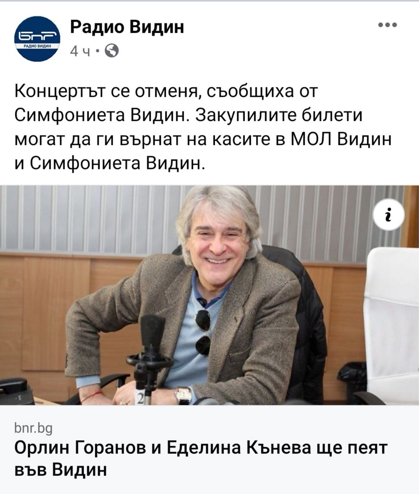 "В нашия Видин, градът, в който нищо не се случва и малкото останали читави и млади хора се чудят в коя стена да си блъснат главата от тъпотия, днес трябваше да се състои концерт на Орлин Горанов и видинската симфониета. Щяха да изпълняват световни класики. Концертът е обявен от две седмици. Този тип мероприятия са позволени на държавно ниво. Из целия град са разлепени постери. Трябваше да се състои в Спортната зала, която често се използва и като концертна. Позволеният капацитет от 30% е спазен. Интересът е голям и билетите са продадени дни преди концерта. Днес, 09.02, по време на генералната репетиция, два часа преди концерта, звъни телефона на директора на Симфониетата и той излиза да говори видимо притеснен. Оказва се, че е получил обаждане от Венцислав Владински, директор на РЗИ - Видин със заплахи, че ще дойде с полиция, ако не отменят концерта!