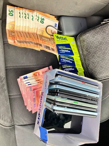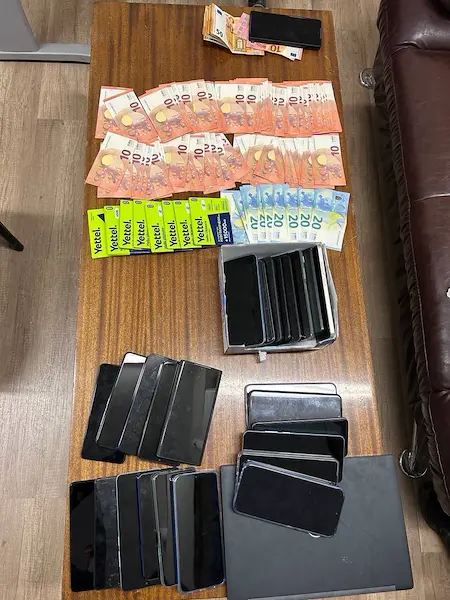 При последвалите процесуално-следствени действия служителите на МВР са открили 2050 евро в брой, разпределени в банкноти от по 10, 20 и 50 евро. Като веществени доказателства са иззети 25 мобилни телефона и множество предплатени СИМ карти, които са били използвани за комуникация и координация на незаконната дейност.