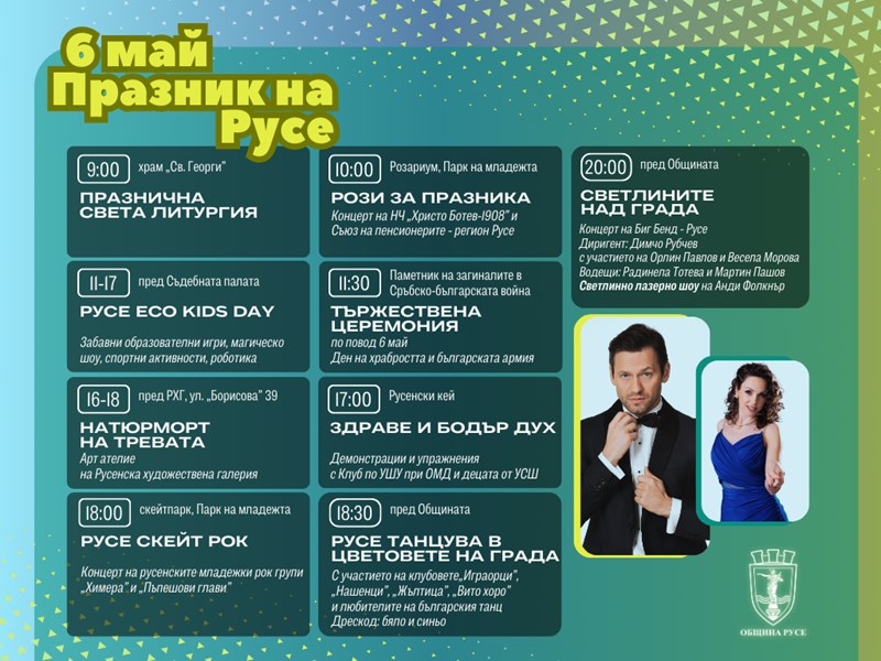 Община Русе подготвя разнообразна програма за празника на града - 6 май, който съвпада с Деня на храбростта и българската армия. Жителите и гостите на крайдунавския град ще могат да се насладят на богата палитра от културни и спортни събития през целия ден на различни локации.