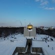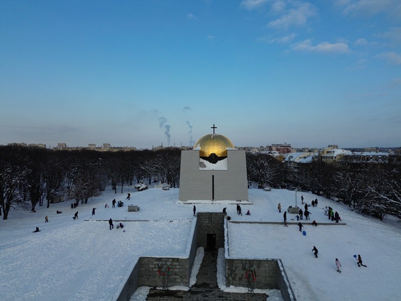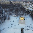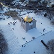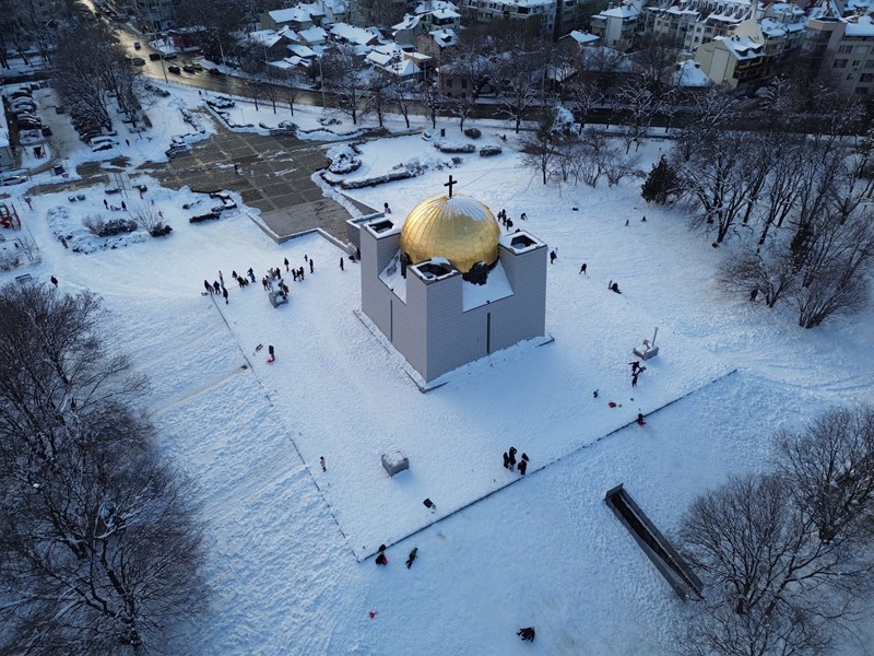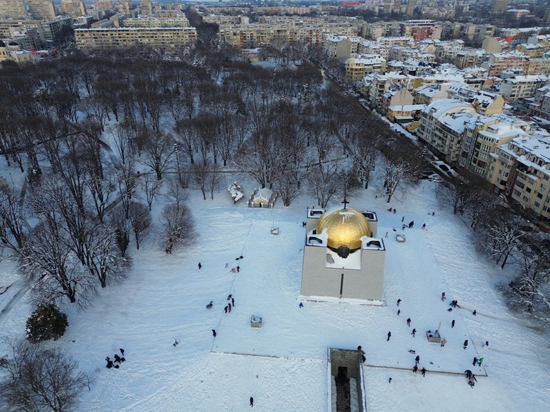 Фотографът Георги Кьостебеков успя да улови магичния момент от птичи поглед, показвайки как златният купол на храма-костница се извисява величествено сред белоснежния пейзаж, докато около него кипи истински зимен живот.