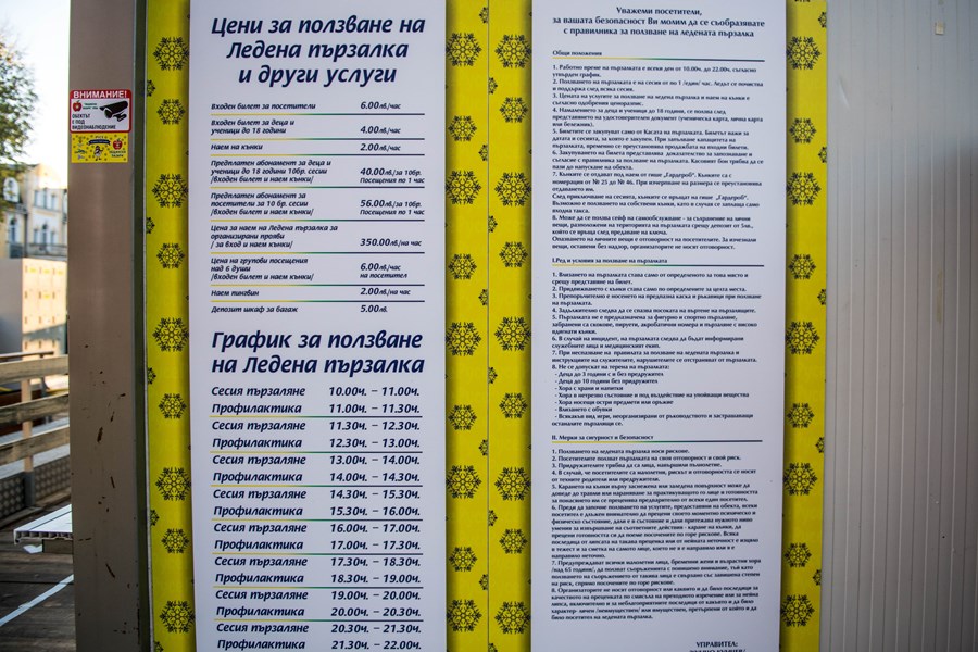 Работното време на пързалката ще бъде от 9:30 до 21:30 ч. всеки ден, дори и по време на празниците. На разположение ще са 230 чифта кънки от 25 до 46 номер. Цената на входния билет за възрастни е 6 лв. на час, а за ученици – 4 лв. Отделно за наем на кънки ще се заплаща 2 лв., като цената за обучителен тренажор под форма на пингвин или мече е също 2 лв. на час. Предвиден е и предплатен абонамент за 10 посещения за сумата от 40 лв. за деца, а за възрастни - 56 лв. За групови посещения /поне 6 души/ цената също ще бъде по-евтина - входен билет и наем на кънки ще се таксуват срещу 6 лв. на час на посетител. Пързалката ще има на разположение квалифициран медицински екип. От 20 ноември всяка събота ще има и инструктор, който безплатно ще помага на начинаещите. А най-малките ще се радват на компанията на приказни герои, с които ще могат да покарат кънки или да се снимат.