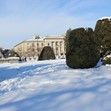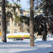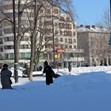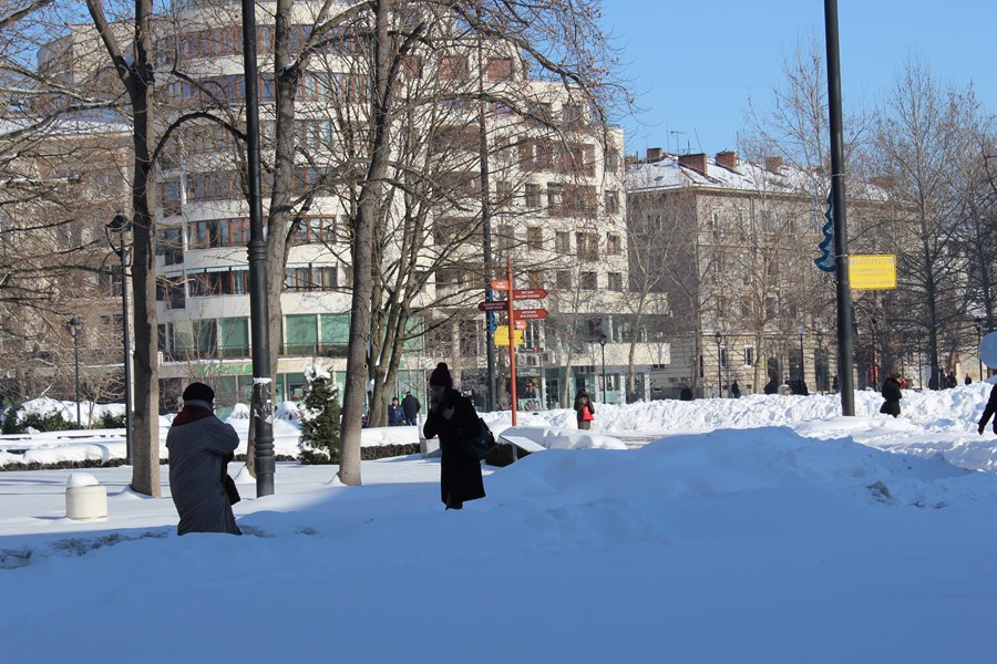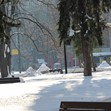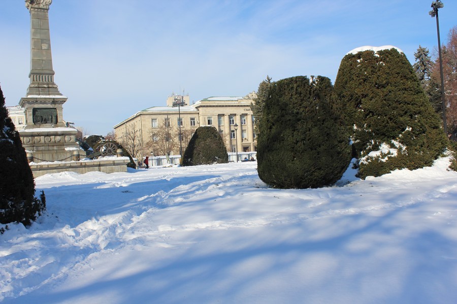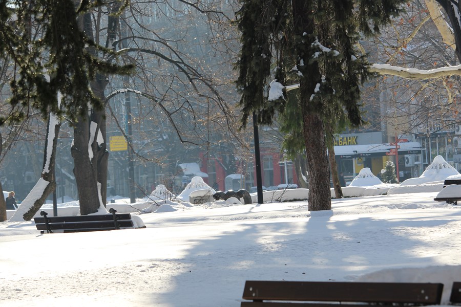 Малки леко заледени пътеки през градската градина срещу Общината и Доходното здание.