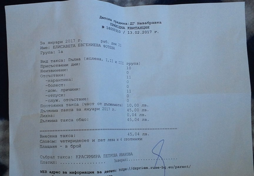 В конкретният, мой случай имам 10 присъствени дни по 2,50 = 25 лева + 10 (постоянна такса според квитанцията) е 35, а общата сума, която дължа е 45 лева?