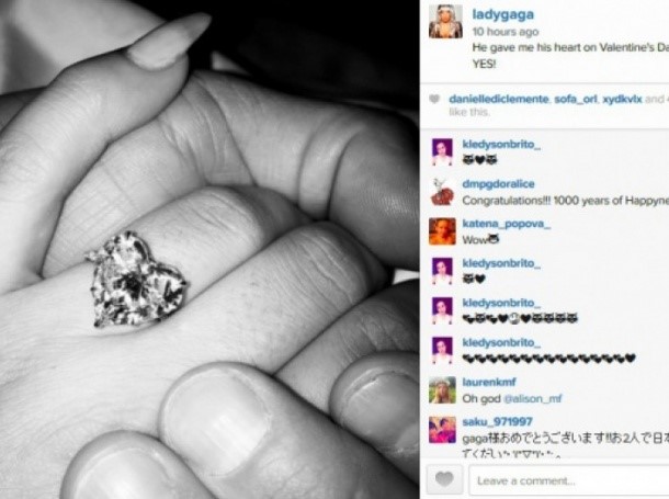 Радостната вест обяви самата Лейди Гага в социалната мрежа "Инстаграм" и публикува снимка с годежния си пръстен на ръката.