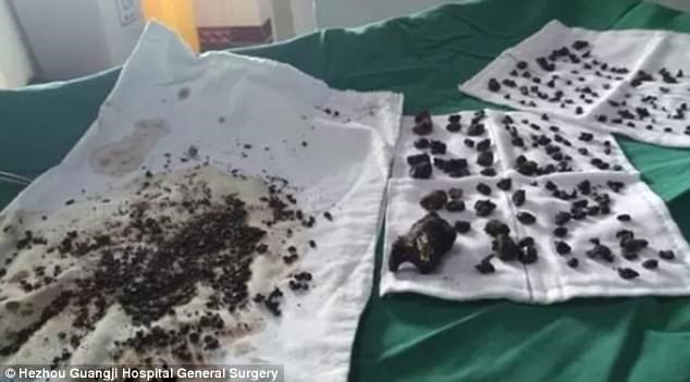Операцията за премахване на камъните на жената продължила повече от шест часа. Пациентката, 45-годишната г-жа Чен, изкарва прехраната си, като събира колофон – кафява, лепкава субстанция, която изтича от боровите дървета. Лекарите от болницата Гуанджи в Китай казаха, че г-жа Чен често е заспивала, след като е имала най-много две хранения на ден, и то предимно в обедните и вечерните часове. Камъните в жлъчката на жената не са се образували за една нощ. В продължение на повече от 10 години жената се оплаквала от коремни болки, но не предприела нищо.