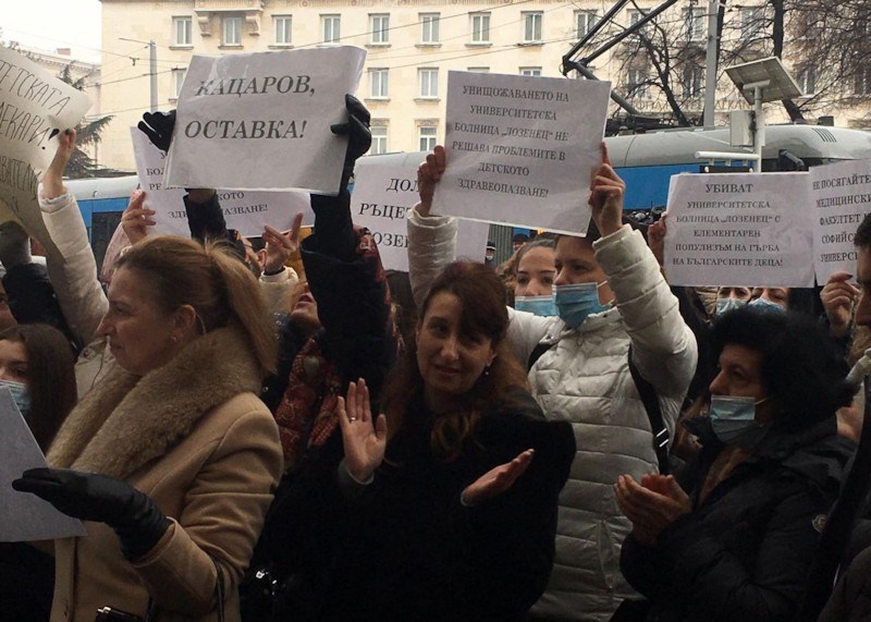 Стотина лекари от болница "Лозенец" и студенти от медицинския факултет на Софийския университет излязоха на протест днес пред Народното събрание срещу подписаното от здравния министър Кацаров протоколно решение, което гласи, че педиатричната болница ще бъде слята с бившата правителствената болница.