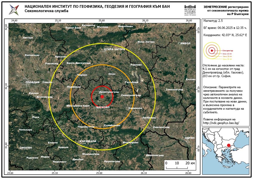От Националния Институт по Геофизика, Геодезия и География напомнят, че параметрите на земетресението са получени чрез автоматичен анализ на наличните в момента данни и е възможна промяна в координатите и магнитуда при постъпване на нови данни.