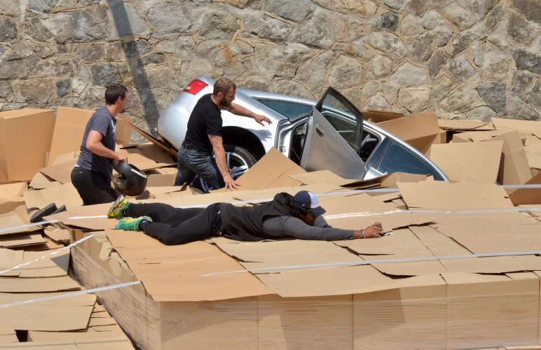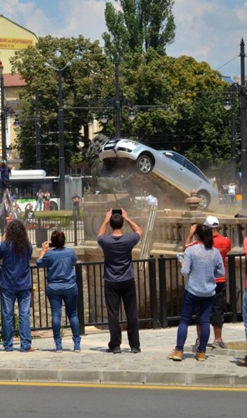 Каскадата представлява автомобилно преследване между Лексус и Ауди, които падат от Лъвов мост в реката, пише "Булфото".