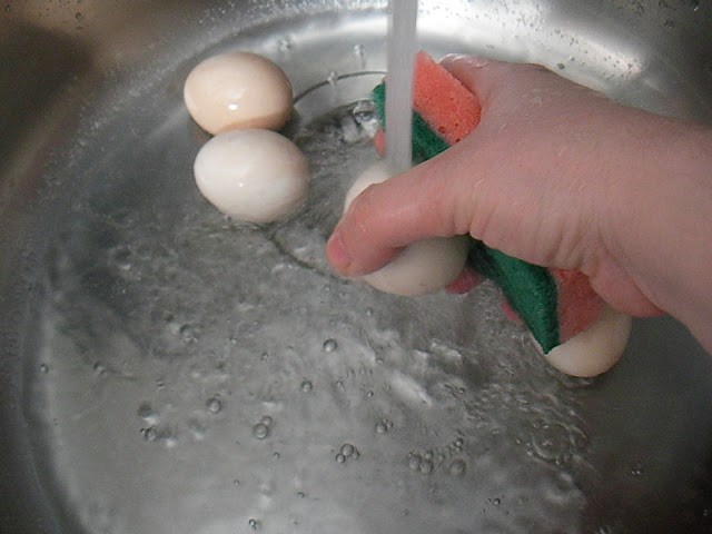 След като водата е завряла, варете яйцата 10 минути. Когато са готови, накиснете ги в студена вода за няколко минути. Изплакнете всяко яйце под течаща вода, като същевременно го четкате с четка или го триете с гъба за съдове. Това ще помогне в процеса на избелване.