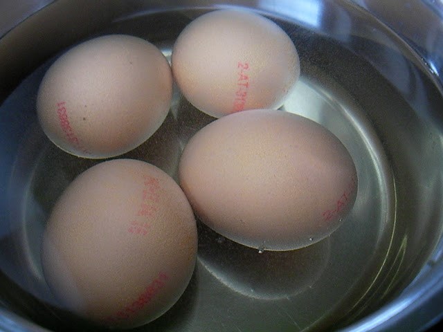 Сложете яйцата в тенджерата. Налейте вода и оцет в равни части. Ще ви е по-лесно, ако наливате една чаша вода и една чаша оцет. Наливайте, докато покриете яйцата. Пуснете котлона и оставете да заври.