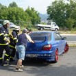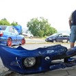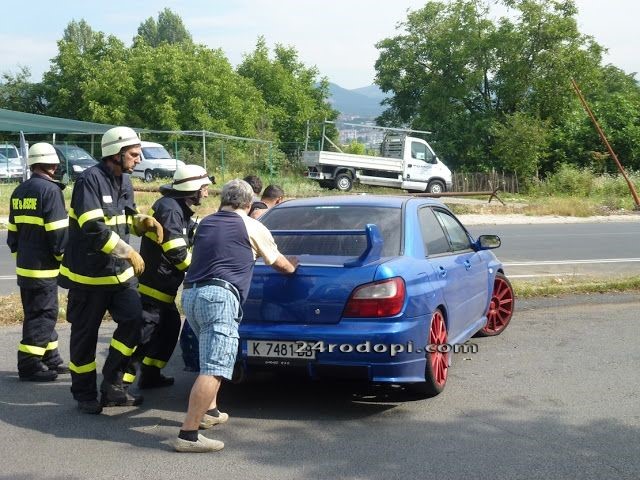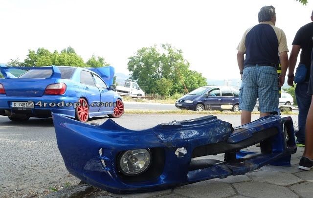 Шофьорът на „Субару" опитал да изпревари „Фолксваген", закачил другия автомобил, след което се забил в металния стълб, поваляйки го на земята.