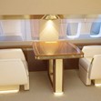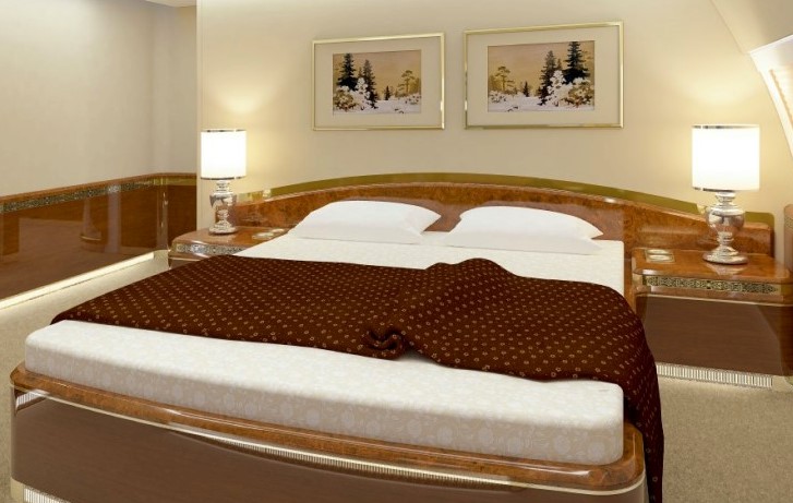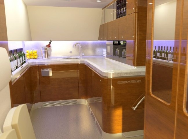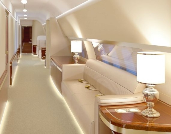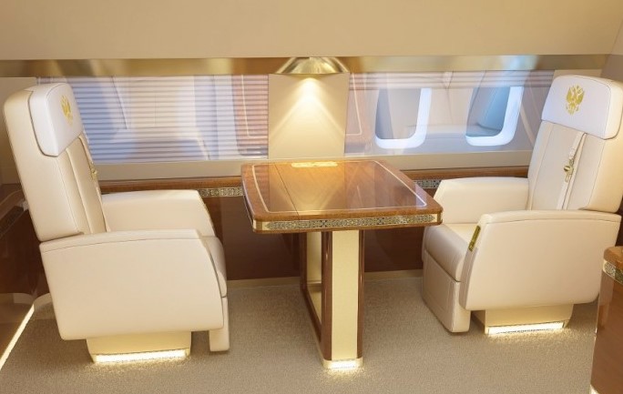 Всички мебели в него са от супер скъпо дърво и кожа, а металните части по тях са позлатени. В самолета технологиите са най-модерните.