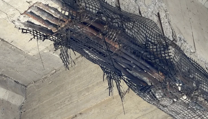 Огледът разкрива шокиращи детайли за начина, по който е стопанисвано съоръжението. Правени са опити за укрепване чрез поставяне на мрежа, която обаче е предназначена за асфалтови покрития, а не за задържане на бетонни отломки от мостови конструкции. Този "инженерен абсурд" не е издържал, и в момента увиснали железни елементи и късове бетон висят застрашително над платното.