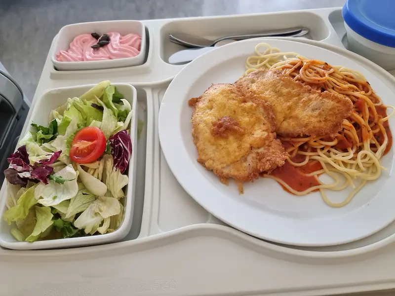 Според журналистката, първите кадри от публикацията ѝ показват стандартна закуска в родната клиника – нарязан хляб и малка опаковка, небрежно завързани в найлонова торбичка и оставени директно върху болничното легло. В пълен контраст, храната в австрийската държавна болница е сервирана естетично в специален поднос и включва топло ястие с месо, ориз със зеленчуци, свежа салата, десерт и марково кисело мляко.