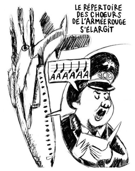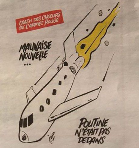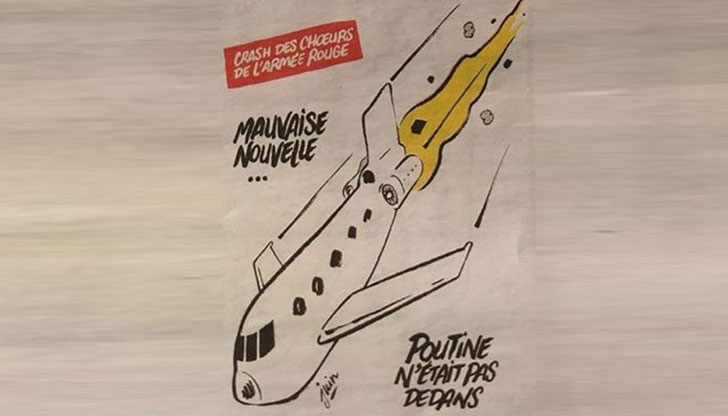 Френското сатирично списание "Шарли Ебдо" реагира на смъртта на руския хор "Александров" при самолетната катастрофа край Сочи с две карикатури.