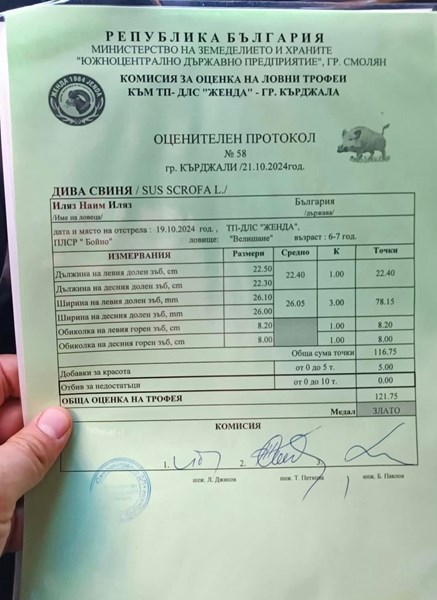 След първите три изстрела глиганът не показал признаци на попадение, но четвъртият изстрел се оказал решаващ и животното паднало на място. Трофейният екземпляр тежи приблизително между 170 и 180 килограма, а глигите му са оценени със златен медал.