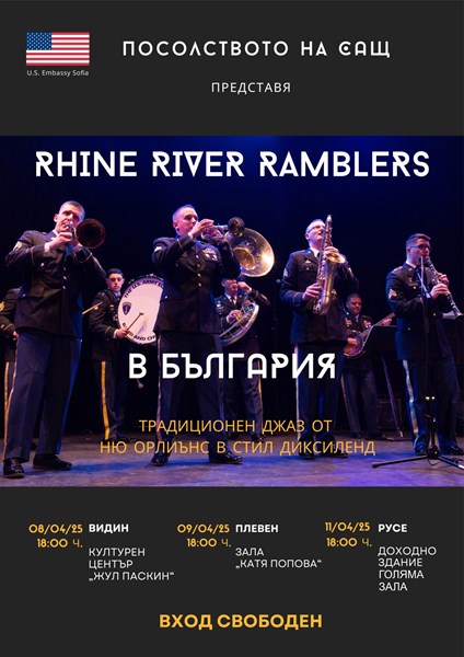На 11 април (петък) от 18:00 часа, диксиленд групата „Rhine River Ramblers" към Оркестъра на Въоръжените сили на Съединените американски щати в Европа ще пренесе публиката в началото на 20-и век със своите вълнуващи мелодии. Русе е един от само трите български града, които ще имат привилегията да се насладят на безплатно изпълнение на американската формация. Желаещите да присъстват могат да вземат покани предварително от касата на Доходното здание.
