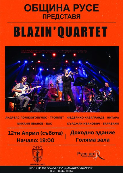 Музикалното пътешествие продължава на следващия ден - 12 април (събота) от 19:00 часа, когато европейската формация „Blazin' Quartet" ще представи своя иновативен проект. Групата, създадена от барабаниста и композитор Сърджан Иванович, обединява таланта на гръцкия тромпетист Андреас Полизогопулос - един от най-популярните музиканти в своята страна, италианския китарист и звезда на европейската джаз сцена Федерико Казагранде, и Михаил Иванов - признат за един от най-иновативните басисти на Балканите.